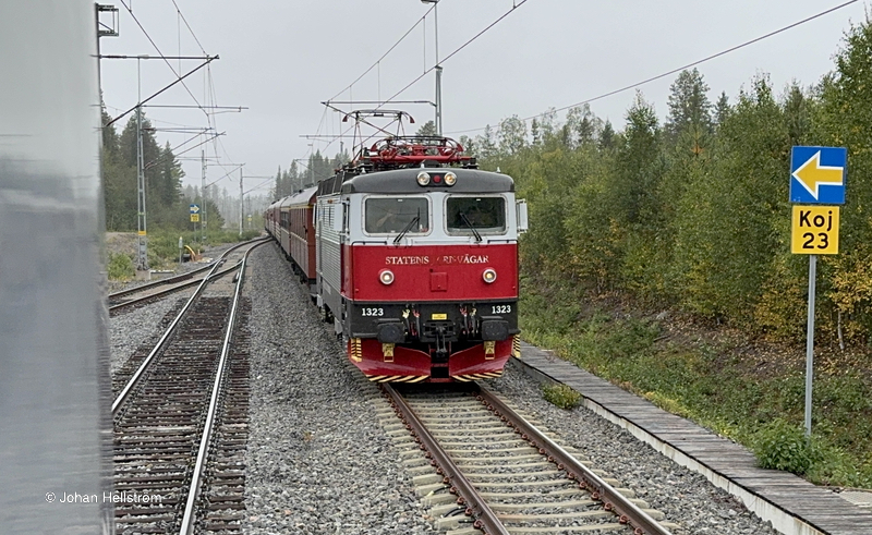 Vildmarkståget, draget av TRVF Rc6 1323, i Kosjärv på Haparandabanan den 9 september 2025.
