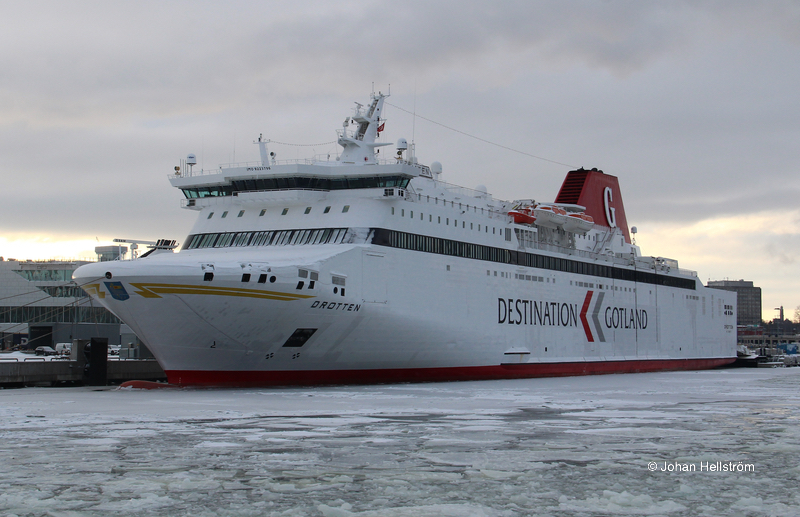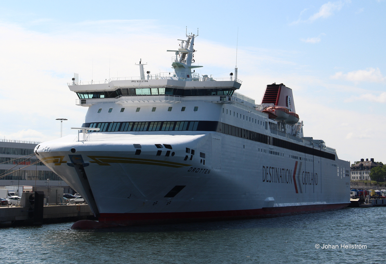 Gotlandsbolaget har en tradition att de nyaste fartygen ska heta Visby och Gotland. När nyare fartyg levereras, får de äldre fartygen byta namn. Här ses m/s Drotten ex. Gotland upplagd i Värtahamnen p.g.a. Coronapandemin den 20 juni 2020.