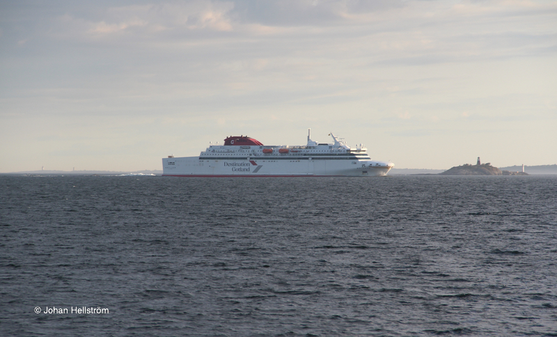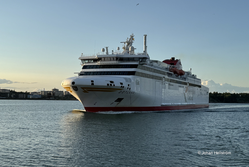 Gotland på väg in mot Nynäshamn på kvällen den 27 juli 2024. T.v. i bakgrunden anas Landsorts fyr.