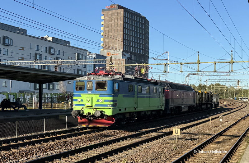 Två bilder av Hector Rail 441.002 Croft som "lokgång" 77592 i Älvsjö den 20 augusti 2025. Hector Rails 441:or är tämligen ovanliga i Stockholmsområdet.