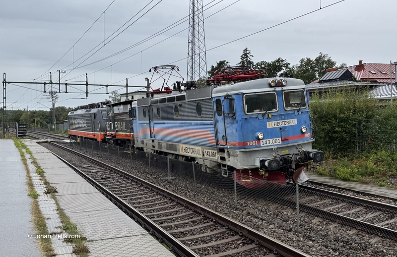Hector Rail 143.048 Saga och 143.060 Jernsida med tåg 40101 i Älvsjö den 27 februari 2025.