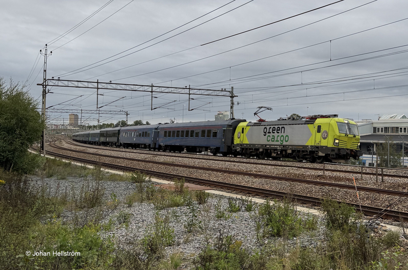 Den 23 juni 2025 var det första gången som SJ EuroNight drogs av ett Vectron-lok hela vägen till Stockholm. Här ses tåg EN 346 vid lunchtid i Älvsjö samma dag, draget av inhyrda GC Rf1 193 408. Green Cargo hyr loket i sin tur av Alpha Trains.