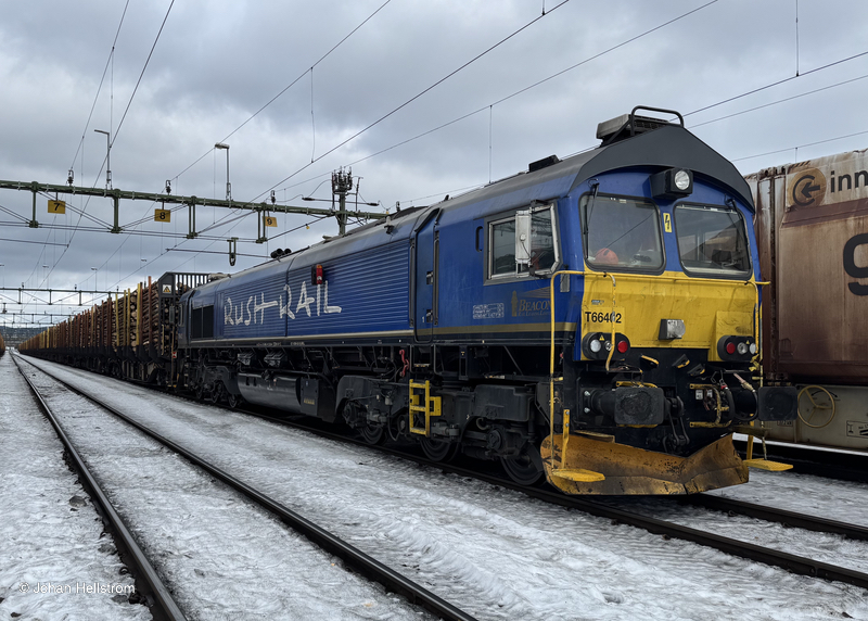 Rush Rail gick i konkurs den 12 december 2016. Knappt en vecka senare stod det klart att Hector Rail fick förtroendet att dra tågen åt Trätåg, som Rush Rail hade gjort tidigare. Övertagandet av trafiken innebar också att Hector Rail kom att hyra in ett antal T66-lok från Beacon Rail. Två av dem (402 och 406) är försedda med ETCS-utrustning, för att kunna köras på Västerdalsbanan, som har ERTMS System E3. Här ses T66E 402 och T66 713 i Borlänge den 21 december 2016.