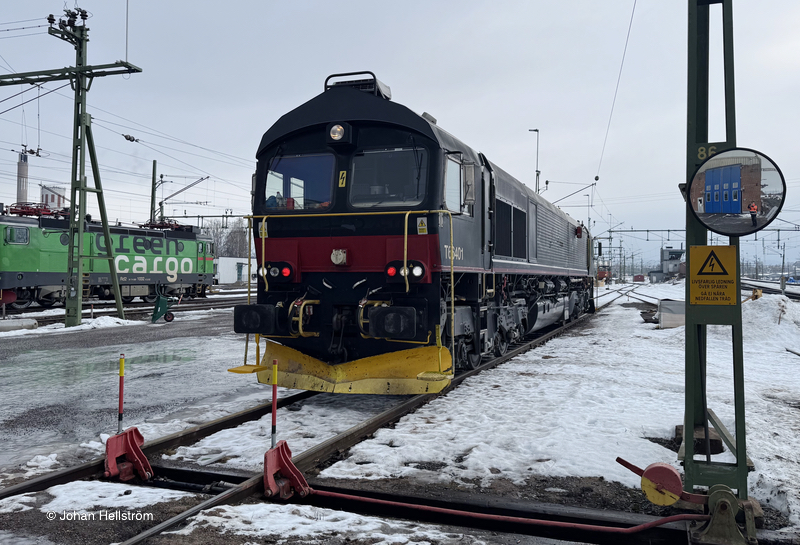 T66E 402 på Borlänge godsbangård den 3 mars 2026, nyss ankommen från Vansbro.
